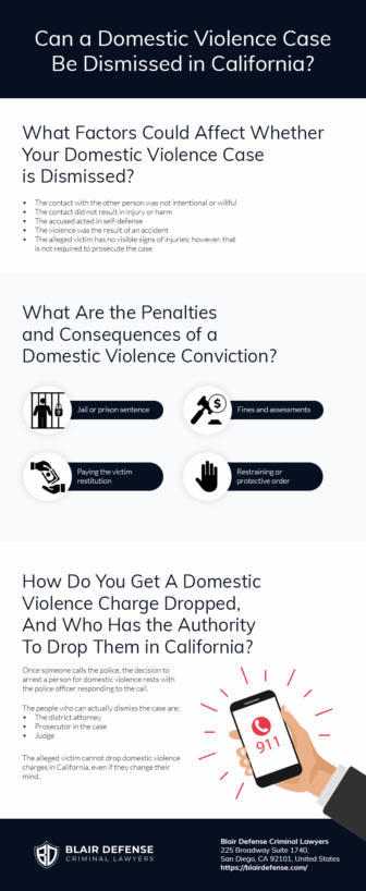 However, it is possible that the prosecutor might dismiss the domestic violence case, or a judge may order the domestic violence case dismissed. Can domestic violence charges be dropped? The best way to find out if you can get domestic violence charges dropped in California is to discuss your case with a criminal defense attorney, even if you are innocent.